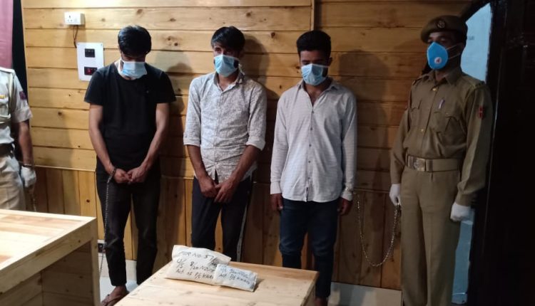 Officers at a checkpoint established near village Sugen intercepted a vehicle Alto K-10 bearing registration number JK04F-0634 with three persons onboard. They have been identified as Javaid Ahmad Mir, Sameer Ahmad Wani and Ashiq Ahmad Sheikh all residents of Kulhama Breewah. During checking officers were able to recover 570 grams of Charas from their possession. They have been arrested and shifted to PS Khag where they remain in custody. Vehicle used in the commission of crime has also been seized.