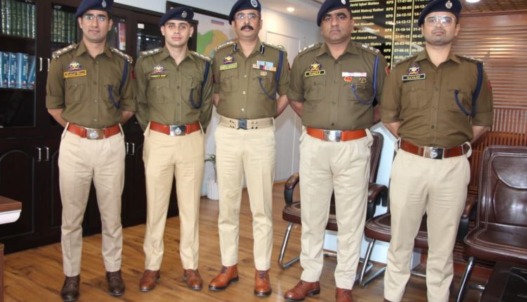Shopian Police today accorded a warm and affectionate farewell to Sh Waseem Ahmad-JKPS, Sh Faisal Hussain JKPS, Sh. Sohail Ahmad-JKPS and Sh Mayanak Khajuria -JKPS, outgoing DySPs, on their transfer from the district.