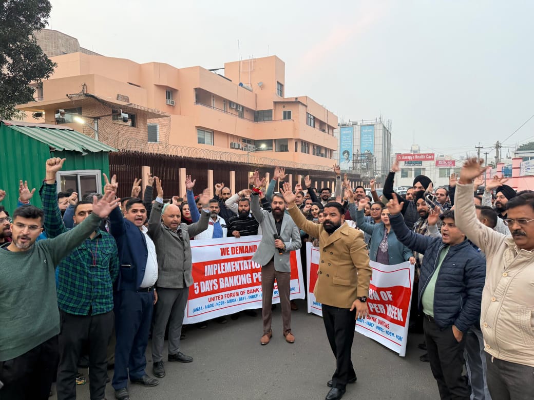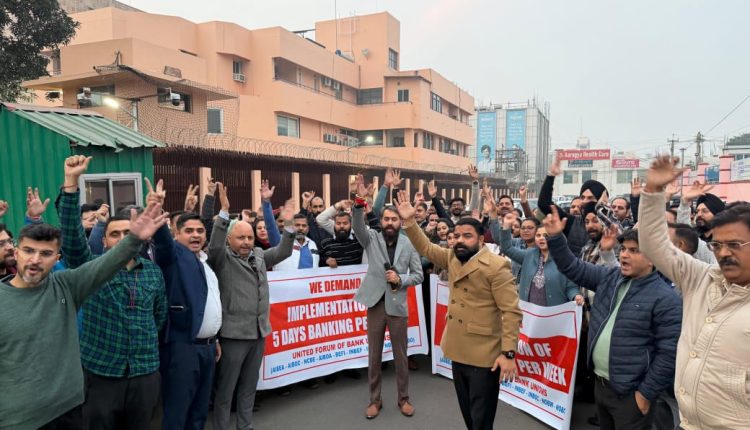 Bank employees under the banner of the United Forum of Bank Unions (UFBU) on Monday staged demonstrations in front of bank offices in Jammu, Srinagar and Leh as part of a nationwide protest demanding the implementation of a five-day work week in the banking sector.