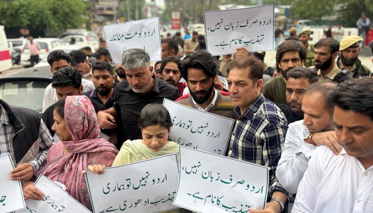 The demonstration comes amid a growing political debate following changes in recruitment rules, where Urdu has been made non-mandatory for certain government positions, triggering reactions from opposition parties.